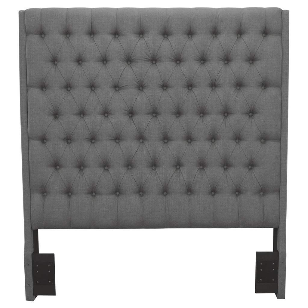 Change up the look of a master or guest bedroom with a stylish modern headboard. Its fully upholstered, complete with a straight lined silhouette that brings refined, understated style to your bedroom. It boasts plush cushioning wrapped in dark gray fabric upholstery for a plush, inviting look and feel. Button tufting adds character and classic dimensionality, perfect for a bedroom with elevated, honest style. A bed frame is required for use with this headboard.