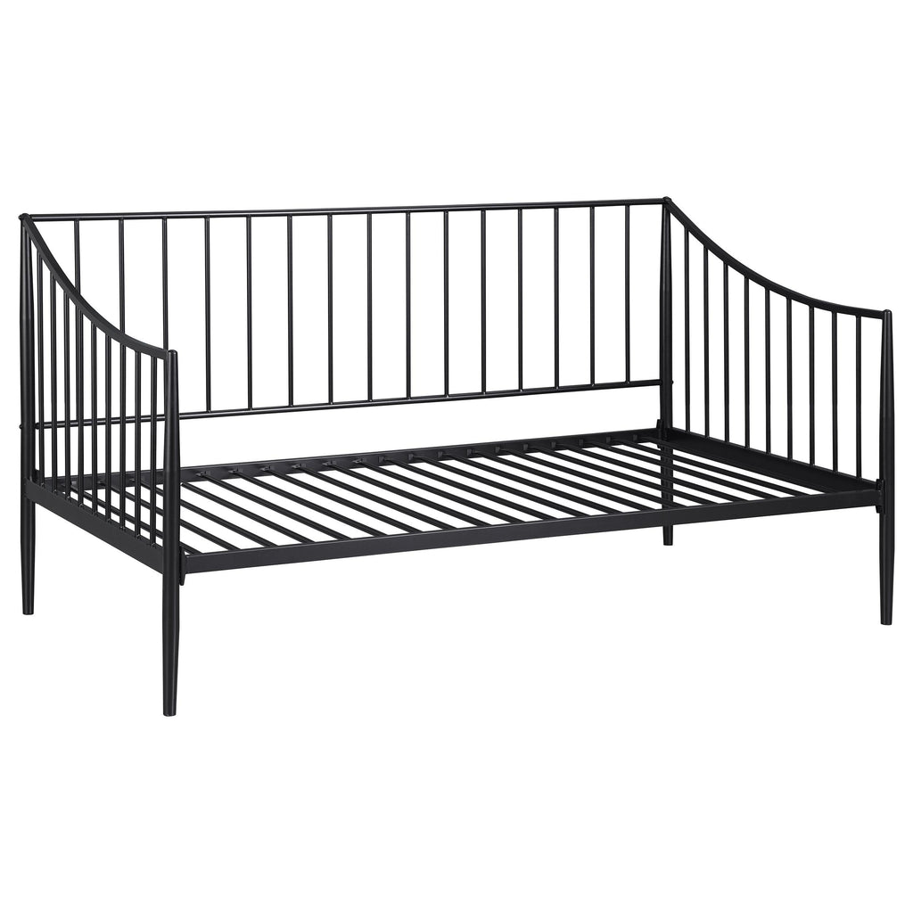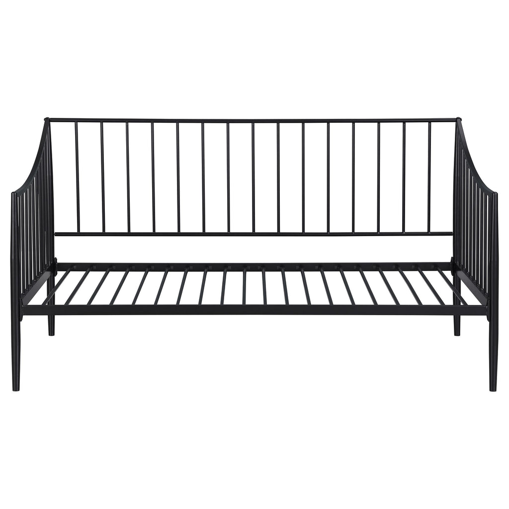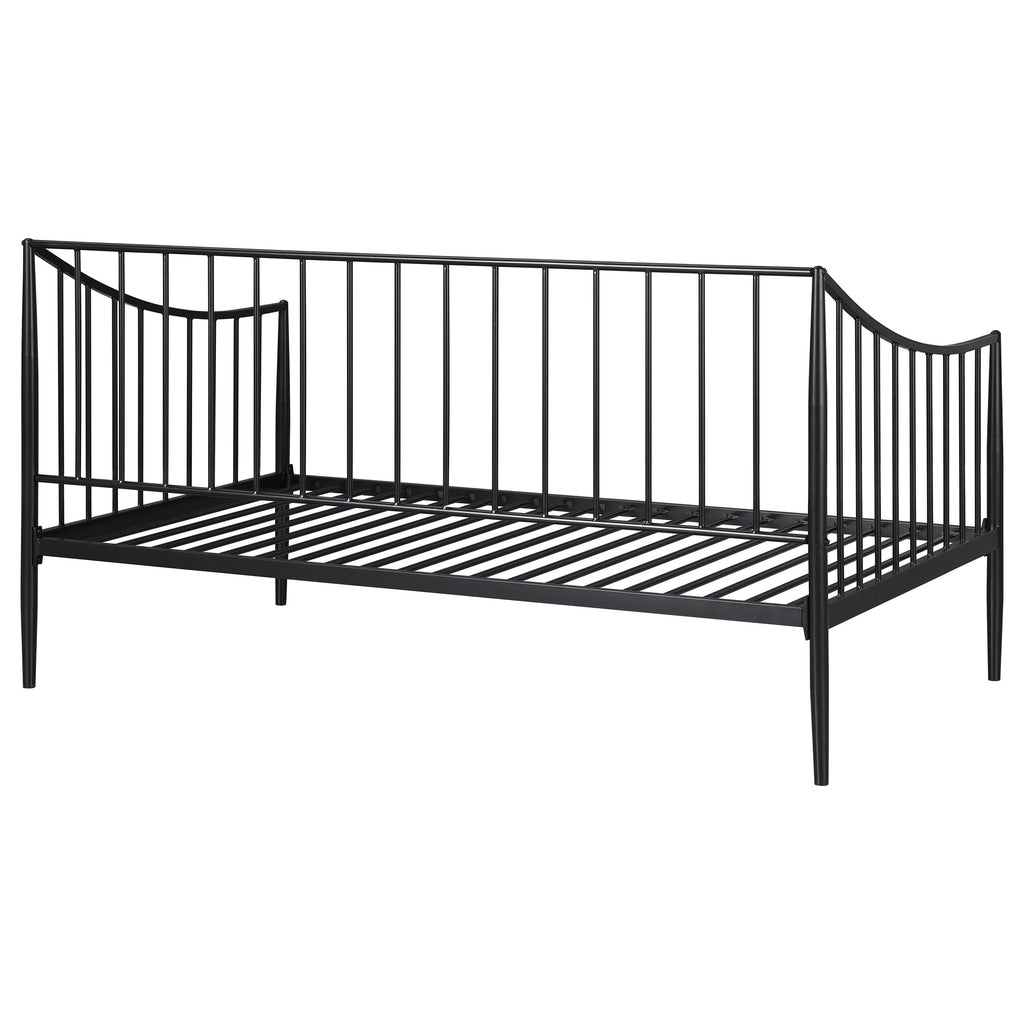 This stylish daybed offers a sleek and practical solution for guestrooms, living rooms, or compact spaces. Constructed from welded metal, it ensures lasting durability and stability. The powder-coated matte black finish enhances its modern, minimalist aesthetic while protecting against wear. Featuring a slatted metal platform, it provides reliable support for a twin mattress without the need for a box spring. Its streamlined design blends seamlessly into various settings, combining functionality with contemporary style. Key Features: • Sleek metal daybed with a minimalist design for versatile use in compact spaces • Durable welded metal construction ensures stability and long-lasting performance • Powder-coated matte black finish enhances modern aesthetics and resists wear • Integrated metal slatted platform supports a twin mattress without a box spring • Designed for reliability and style, blending function with a contemporary look • Ideal for guest rooms, living areas, or smaller spaces with practical versatility