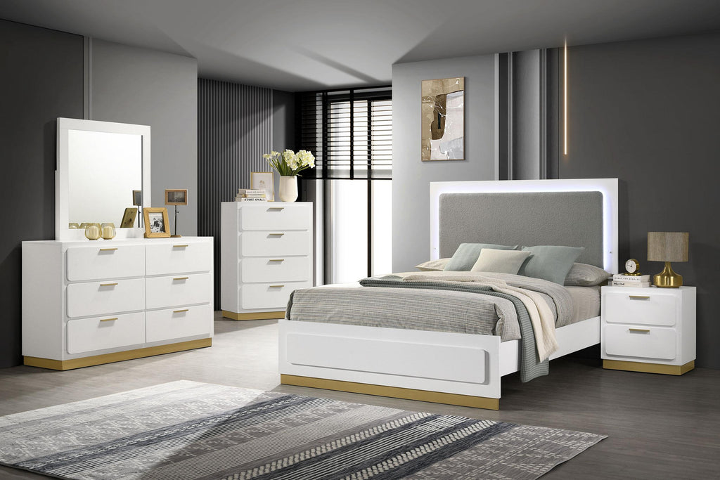 Modern luxury with a clean look offers a perfect fit for updated bedrooms as the bed anchors a sleek primary suite or guest bedroom. Wood and wood products construct a bed with clean lines and an extra tall headboard that stands out to be noticed. Tech features fold LED strip lighting into its headboard, with a touch-activated light button on its front panel. This bed offers simplicity with sleek elegance, as straight legs and a headboard insert join a dimensional design element on its footboard. Choose this bed for its versatility and convenience, making a bedroom a haven for both sleep and serenity.