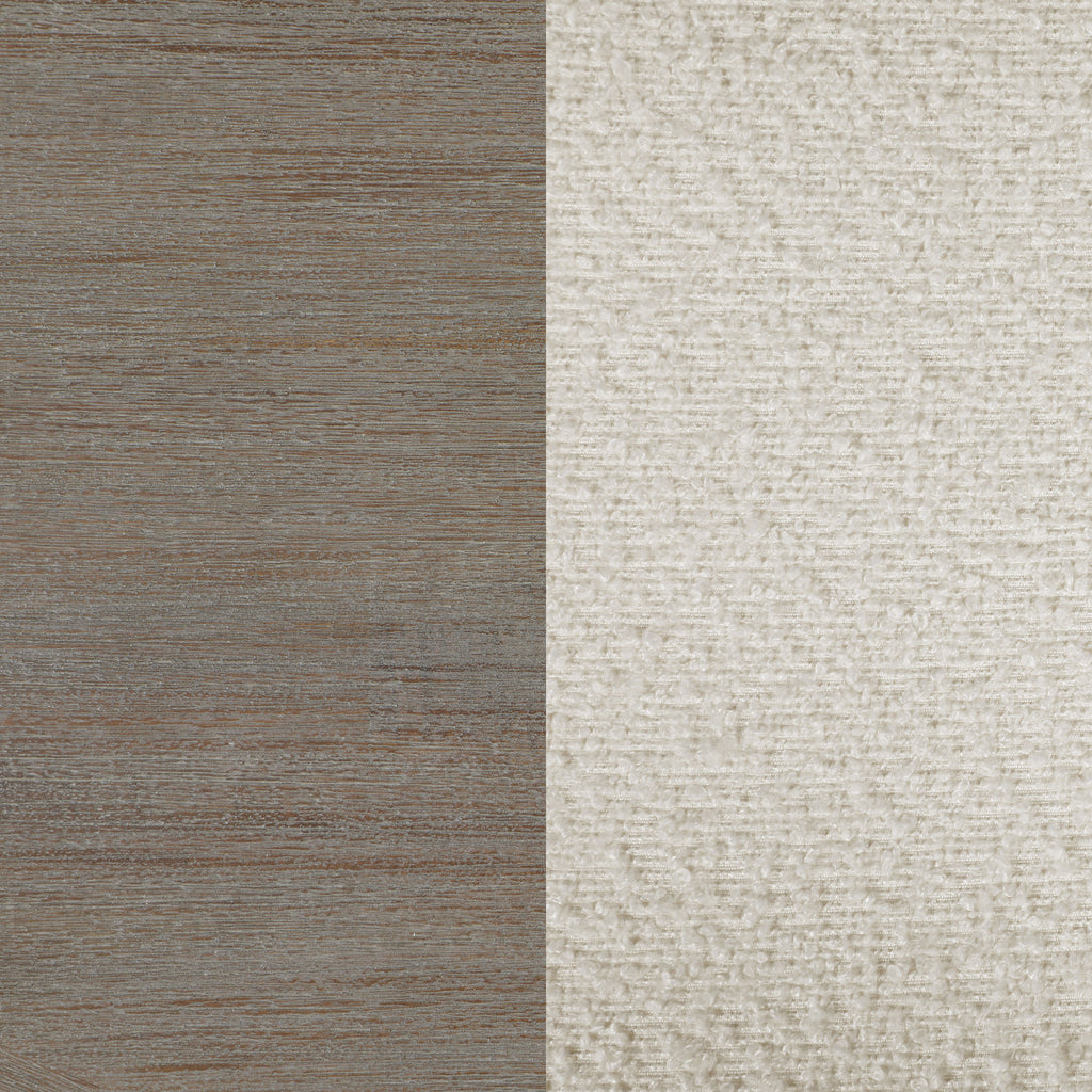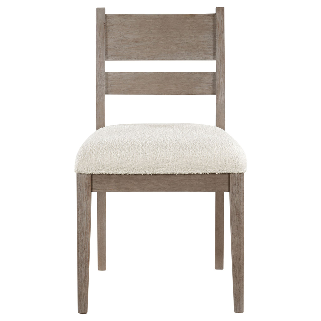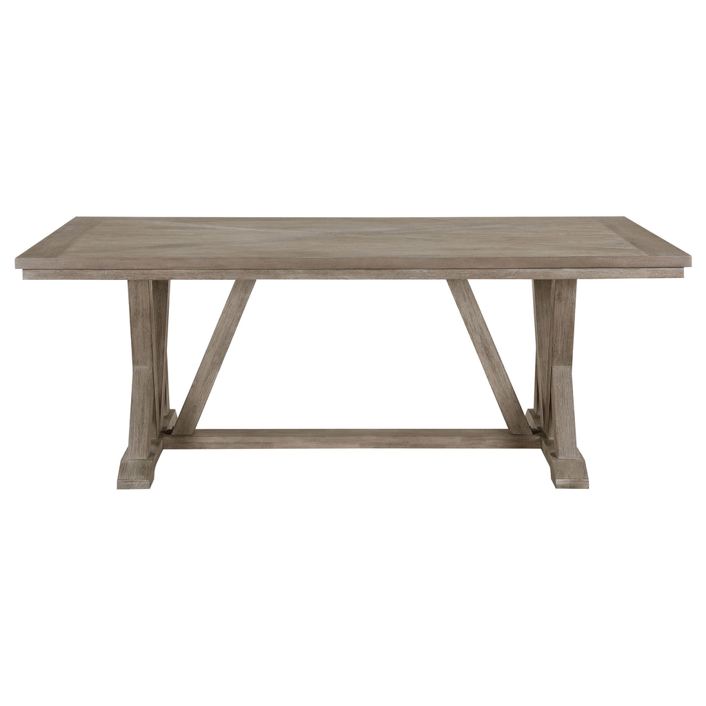 Trestle inspired style brings charming character to a five-piece modern farmhouse dining room set. It focuses on a rectangular dining table, complete with four side chairs that create a cohesive look with a casual coastal grey finish. Cream upholstery adds a fresh, bright touch, perfect for an inviting kitchen or dining room. Chairs feature modified ladder backs, offering artisan appeal, while the decorative table base instills the perfect touch of dimensionality. Foam padding adds comfort to seats, perfect for family and friends to enjoy a meal and conversation.