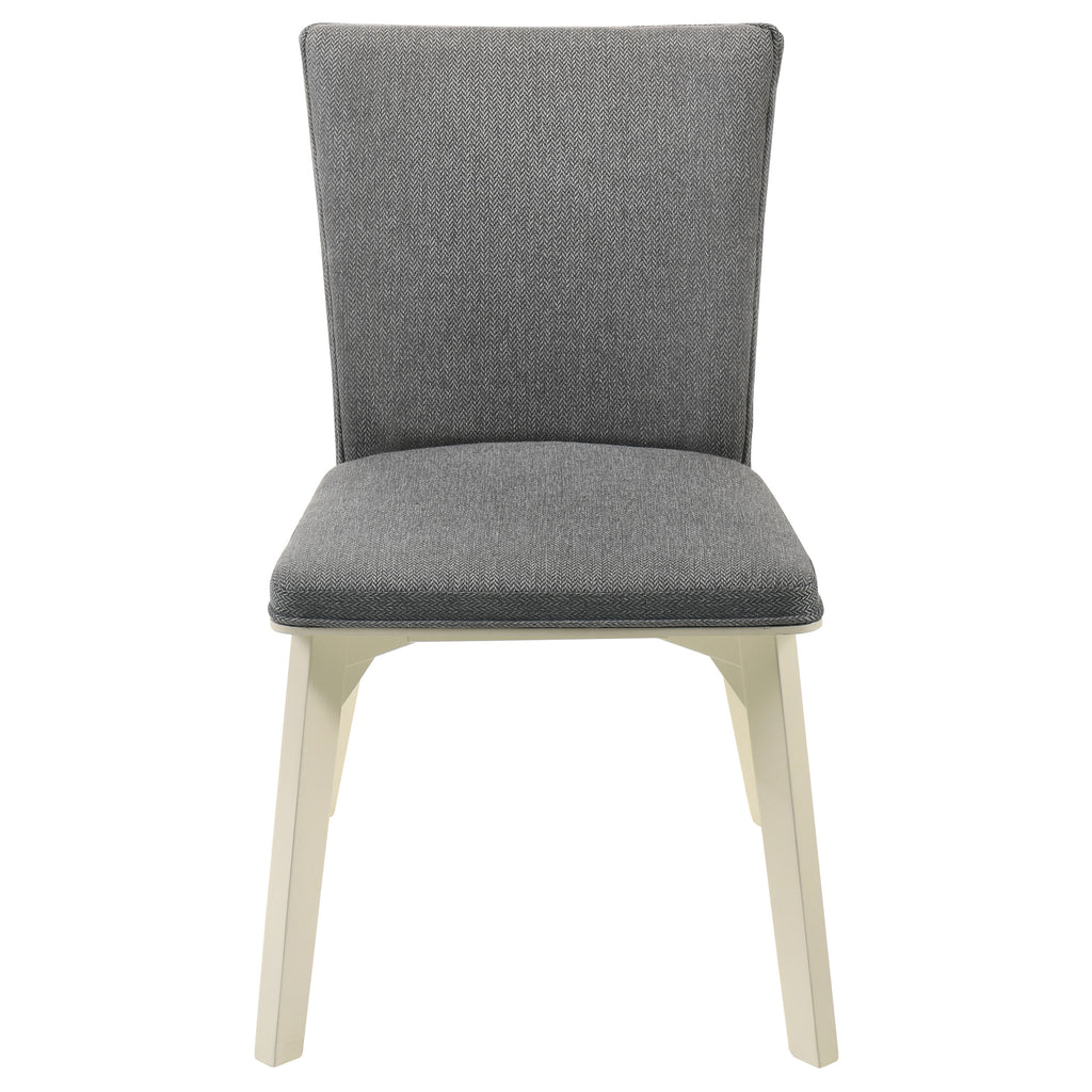 Enhance your dining area with the modern simplicity of this comfortable dining chair. The chair features soft gray fabric upholstery over plush cushioning for a comfortable seat. Its sleek, angular white base creates a subtle, airy contrast, while its streamlined design makes it a perfect match for contemporary spaces. Ideal for long meals or casual get-togethers, this chair adds both style and comfort to your dining set.