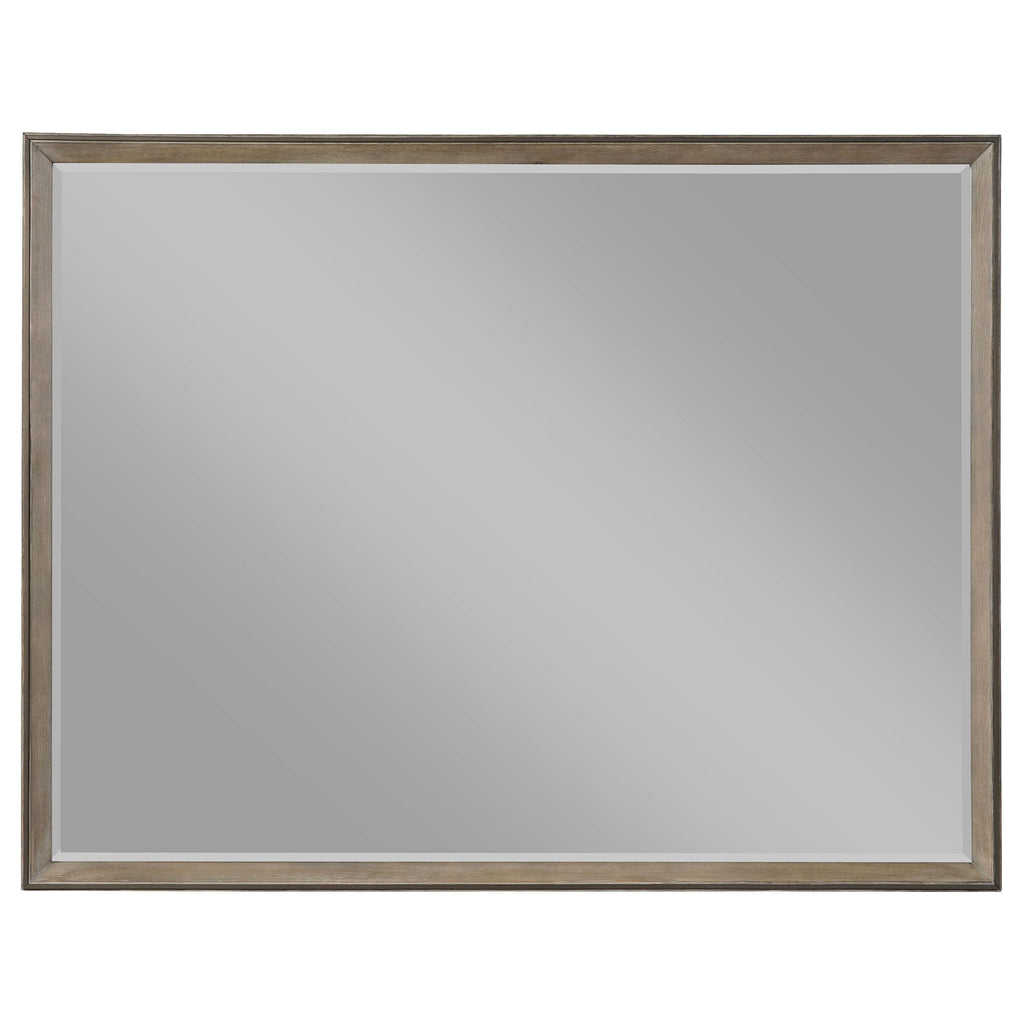 Invest in the inviting style and striking architectural allure of this five-piece modern bedroom set that centers on an upholstered bed. Perfect for relaxation in a soothing bedroom ensemble, the set delivers ample storage with a eight-drawer dresser and mirror, a five-drawer chest, and a two-drawer nightstand. Cool cream upholstery with grid style tufting decorates the bed, while a Taupe oak wood finish is invitingly neutral to complement the linens of your choice. The extra-tall headboard creates a structured profile for the set, which is adorned with long bar pulls on its drawer fronts. Use wide tops for decor that brings personality and character to your welcoming, refined bedroom.