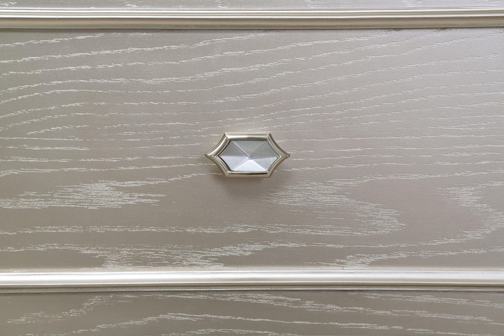 Completely reimagine your bedroom with the glamorous vibes of a four-piece modern bedroom set. Designed to make a statement, the set centers on a gorgeous silver oak finish bed complete with ivory upholstery on the head and footboards. Touch operated LED strip lighting adds ambiance to the headboard, while drawers in the side rails of the bed increase storage in your bedroom. The set includes a nightstand with a built in USB port for easy charging, and decorative curves and classic hanging hardware enhance the look with regal elegance. A nine-drawer dresser with felt lined top drawers and a lighted mirror completes the set, offering abundant storage and organization and a sophisticated look and feel.