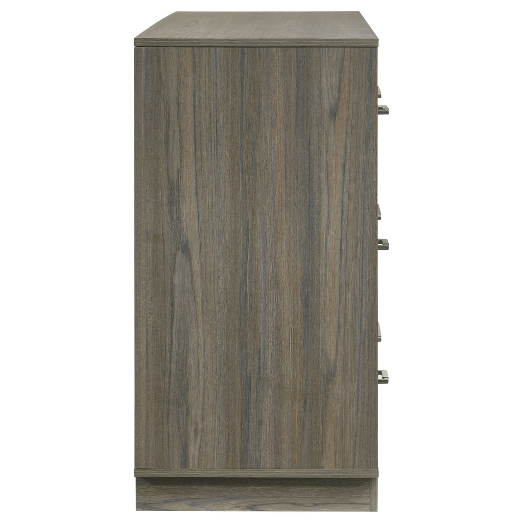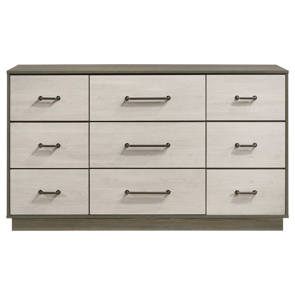 Introduce a blend of modern style and practical functionality to your bedroom with this sophisticated nine-drawer dresser. The contemporary two-tone melamine design offers a chic aesthetic, while the ample storage space ensures your belongings are neatly organized. Featuring a hidden jewelry drawer for added convenience, this dresser is as versatile as it is elegant. The antique nickel handles add a touch of vintage charm, and the floating base provides both stability and a sleek appearance. Crafted from durable melamine and engineered wood, this dresser is built to last, offering both beauty and functionality to your home.