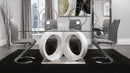With its artistic design and geometric style this elegant dining table is just what your dining room needs. Featuring sculptural legs in a white finish, rectangular glass tempered top and chromed base to finish the look.