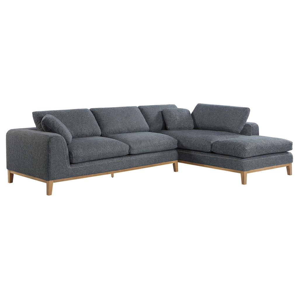 Add style to your space with this magnificent Mid-Century Modern sectional sofa. This low profile 2-piece sectional is exceptionally upholstered in a textured cool grey woven fabric accented with contrast blanket stitching in beige. Equally appealing is the beige platform base with tall tapered legs. On one end, it features a wide track armrest, while the other is open-ended in a chaise-like design. Two included throw pillows give this sectional added coziness.