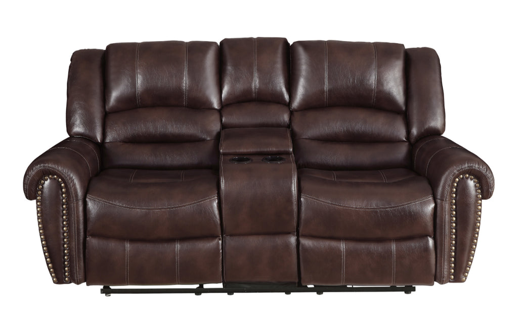 Homelegance Furniture Center Hill Double Glider Reclining Loveseat w/ Center Console in Saddle 9668NDB-2