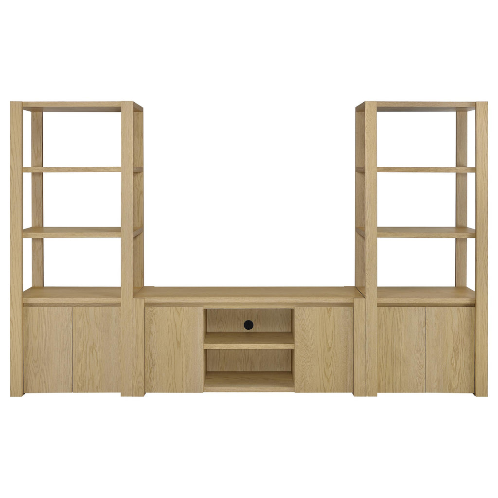 This tall media tower invites serene sophistication with its airy silhouette and thoughtful design. Three open shelves offer a stage for cherished décor, while two lower doors conceal an adjustable shelf for curated storage. A discreet cord cutout ensures seamless connectivity. Crafted from engineered wood with a scratch-resistant and eco-friendly laminate veneer, its light oak finish brings organic warmth to any living room, media center, or entertainment corner. Key Features: • Media tower with open design and closed cabinet in a serene light oak woodgrain finish • Light oak tone enhances the natural character with warmth and understated charm • Three wide shelves showcase books, keepsakes, or audio-visual essentials • Two doors reveal a spacious cabinet with one adjustable shelf for hidden storage • Rear cord cutout keeps electronics connected while maintaining a clean profile • Crafted from engineered wood with a durable, eco-friendly laminate veneer