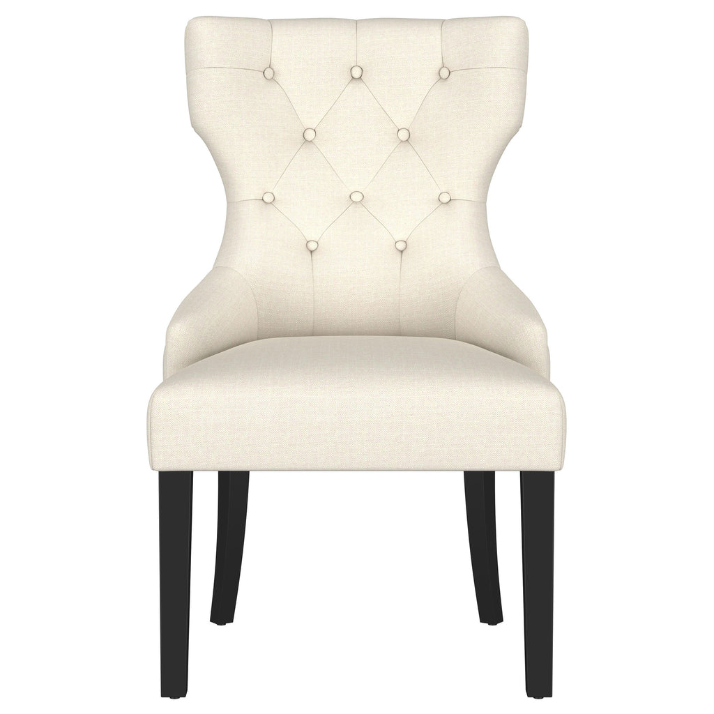 Comfort and style collide to perfection in a seven-piece traditional dining set. Delivering refined but accessible style, the set features a wood dining table in a rustic smoke finish, offering a round tabletop and a decorative pedestal base. Its warm coloration is perfectly complemented with oatmeal upholstery on six side chairs. Chairs feature comfortable and supportive foam cushions, with tall backs that encourage leisurely conversation. Backs are button tufted, adding to the classic look and feel of this set.