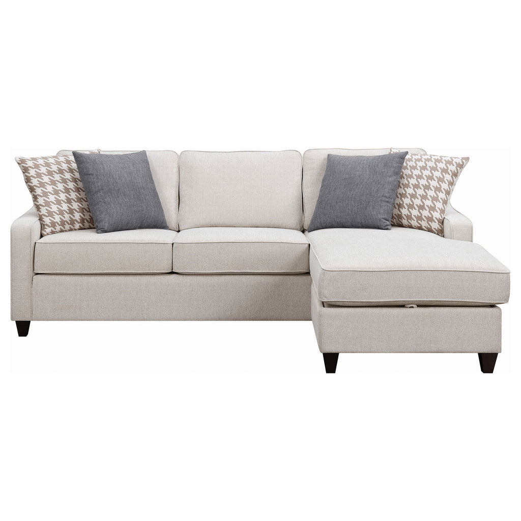 Ready to provide a sensible and stylish bonus to a transitional space, this sectional is a solid choice for a redesign. Perk up a living room or entertainment space with a comfortable and tasteful design. Configured for maximum flexibility, it accommodates sitting, lounging, and sleeping. An end lounge section adds a tasteful angled effect without taking up excessive space. With a gorgeous platinum upholstery and contrasting deep finish, tapered feet, it's a wonderfully versatile selection. Key Features: • The McLoughlin collection brings the industrial loft style to life • Its easily reversible storage chaise allows this versatile sectional to adapt to any small living space • Sloped track arms give a sleek elegant look • Collection includes four accent pillows in coordinating fabrics • Seat and back cushions are fully reversible for easy cleaning and maintenance • Matching storage ottoman is available